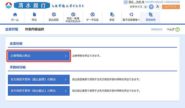 「しみず法人ダイレクト」をご利用いただくための企業情報、先方負担手数料情報を変更・照会することができます。